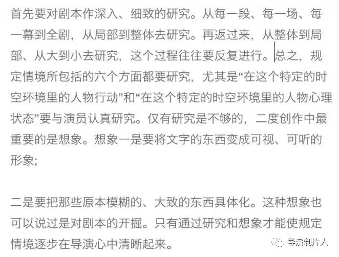 导演是以作者的剧本为根据的,他的创造开始是以剧本为起点的,他的创造程序,正与作者相反,作者是以现实生活为创造起点,而以完整的剧本创作告终。导演的工作开始就是以作者的终点为起点,而是以创造完整舞台演出再现现实生活形象为终结段落。两者不同的工作程序: