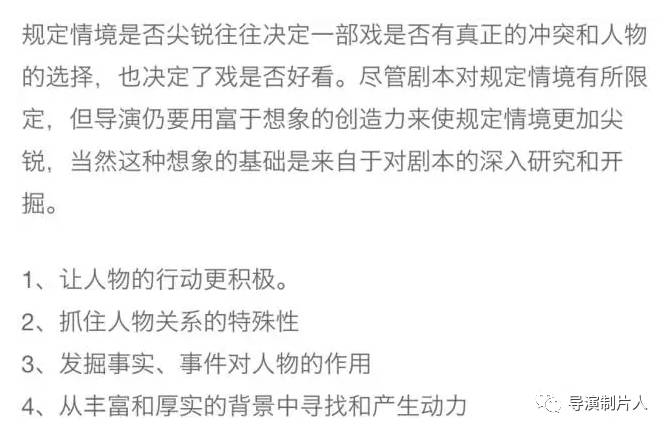 4、特定的人物关系(外部规定情境就是剧本的事实、事件,也就是剧本的情节格调,剧中生活的外部结构和基础)。
