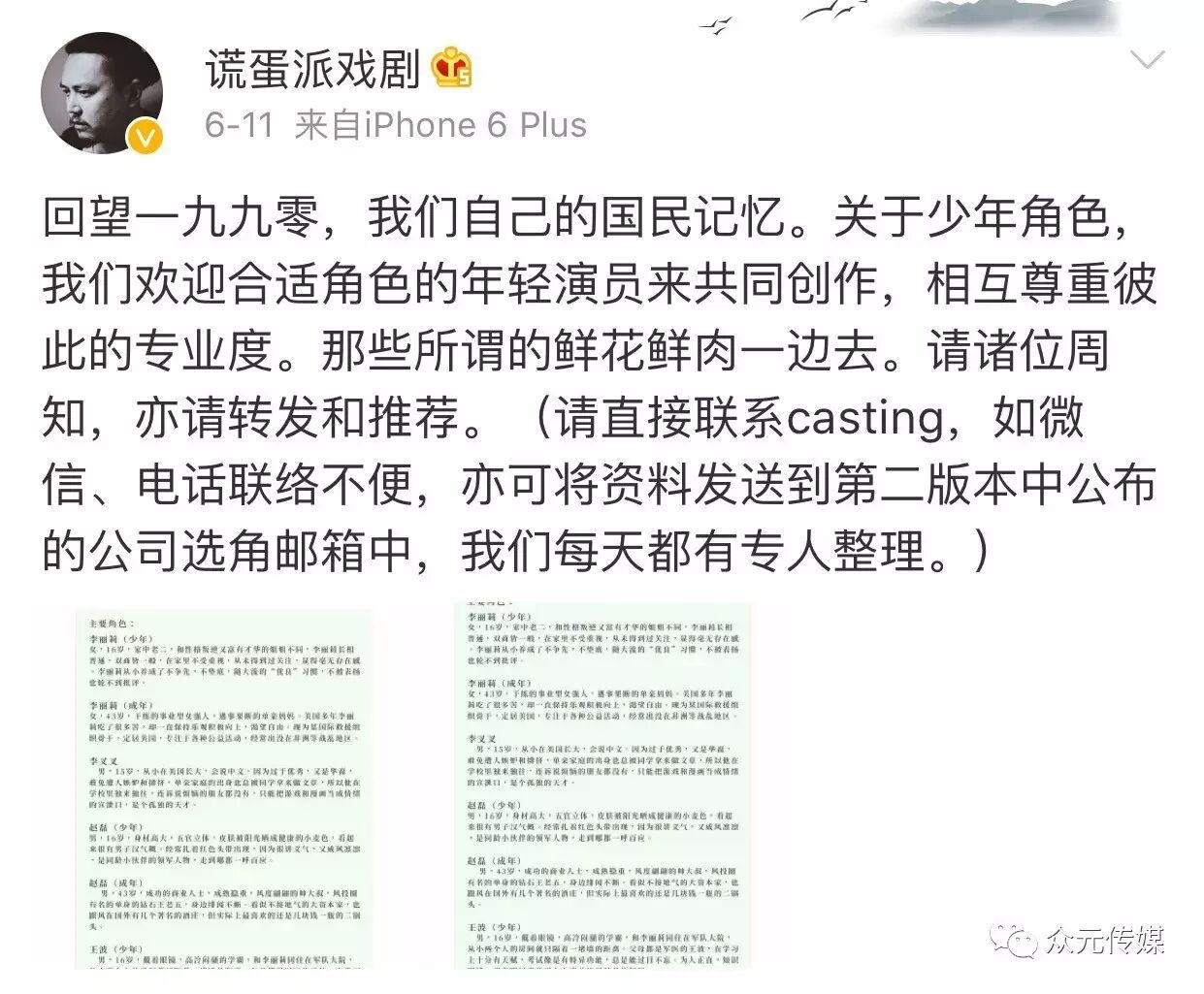周荣扬:“鲜花鲜肉那些流量明星刷出的流量,比不上他们对作品品质的伤害。那么多IP剧纷纷扑街,那么多流量明星抠图尬演,《深夜食堂》华语版2.3分的纪录,就没有人感到羞愧吗?观众需要新鲜的面孔,但更需要尊重。这尊重来自于专业度,我们相信戏保人,而不是人保戏。演员选上之后,围读剧本是基本要求,还会有一段时间的培训,有老师会和他们讲九十年代的北京,还会有台词口音方面的课程。所以,有志于表演的年轻演员们,请把你们的简历发过来吧。”