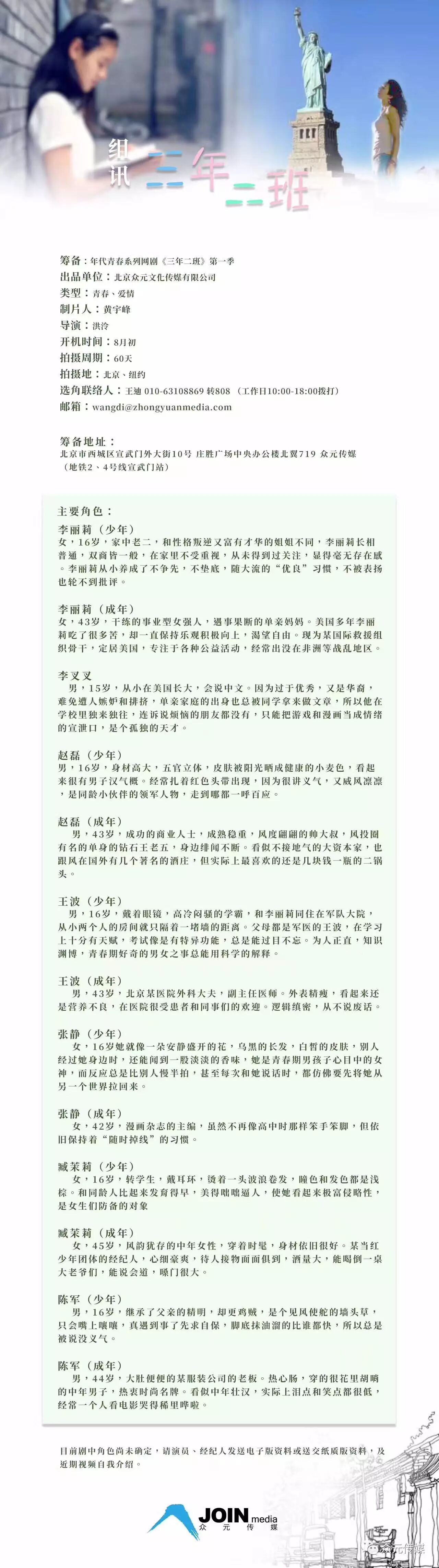 众元传媒主要从事院线电影、网剧、及综艺的投资、出品与制作与。最近正在筹备的网剧《三年二班》也正在招募演员阶段。
