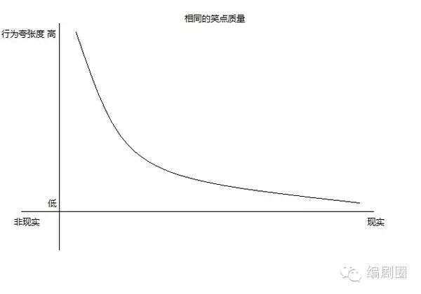 在大数据时代,喜剧创作者们往往会检索海量的gif图来寻找创意,除了笑点很足、时间较短外,这些gif图往往还有另外一个共性,就是大多数是生活实拍。这其实又衍生出来另一个问题:当创作者把这些生活实拍的笑点搬到大荧幕上的时候,往往在相等的时间内达不到gif图里所呈现出的效果。而如果喜剧中的世界观和人物设定越背离现实世界,这种效果就会越弱。一个相同的笑点,在动画喜剧、喜剧和现实世界中所呈现的质量是完全不同的,曲线有可能如下图。
