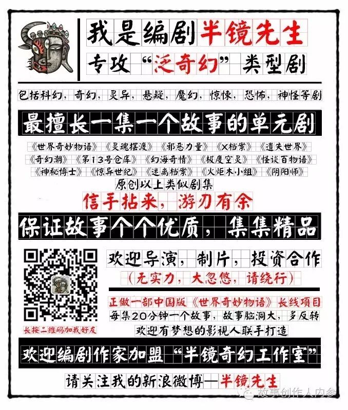 故事创作人内参——实用型故事创作课堂。分享干货编剧技巧,实用故事技法,和经典剧本。适合编剧,作家,导演,漫画家等故事创作人关注。非干货,不分享;非精品,不推送。加小编微信:darusheng2046。拉你进官方高品质编剧群。